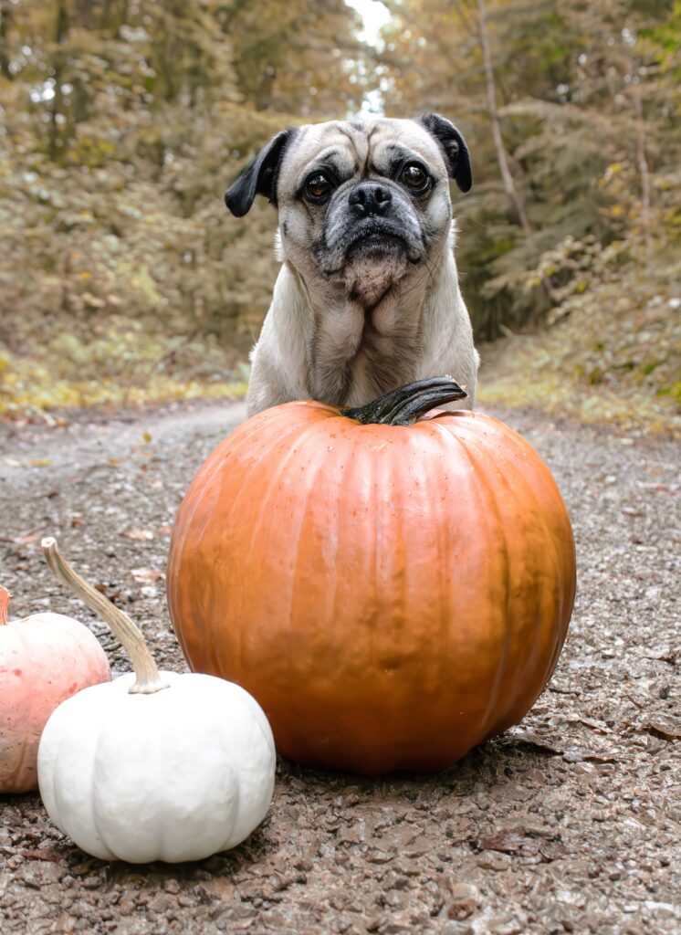 Ein Spaziergang durch buntes Herbstlaub, Kürbisse in warmen Farben, und dein Hund im Mittelpunkt – so schön kann Herbst sein.
